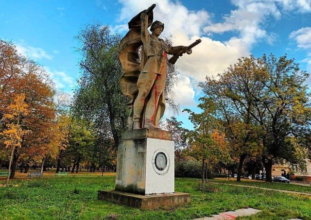 Tsekissä puna-armeijan sotilaita kuvaavan patsaan jalustaan on taiteiltu ... pesukone: