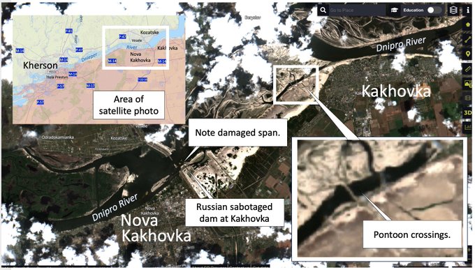 Dnepr on palannut normaaliin uomiinsa. Jos padon räjäytyksen tarkoituksena oli estää Ukrainalaisia hyökkäämästä joen yli, niin se hyöty alkaa kohta olla menetetty kunhan tulvan alla ollut maa kuivuu ja kovettuu.
