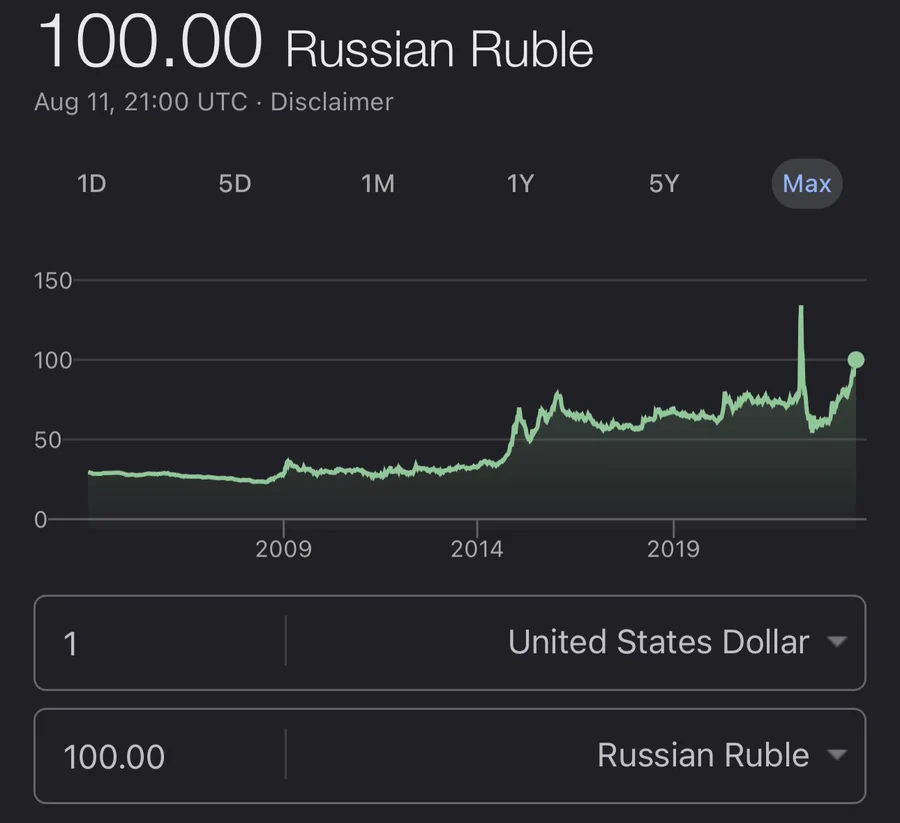 100 Russian Troublea on nyt tasan yksi USD. Koiranleuat arvelevat, että Venäjän Keskuspankki on säätänyt vaihtosuhteen tuollaiseksi jotta rahanvaihtajat voivat toimia päässälaskun turvin ilman laskukoneita.