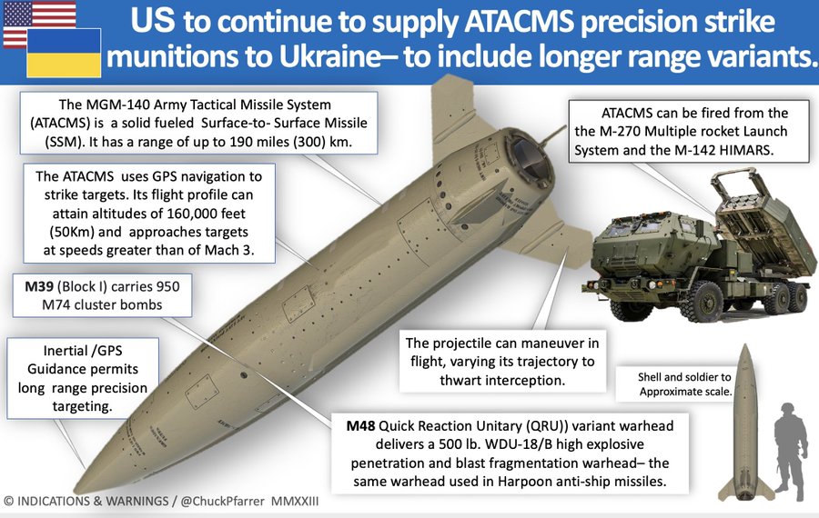 USA on huhujen mukaan lähettämässä ATACMS-ohjuksiaan Ukrainaan koska sen omat joukot ovat saaneet tilalle uudempaa ohjustyyppiä. Pisimmillään taktinen MGM-140 ohjus kantaa 300 km ja niitä pystytään laukaisemaan HIMARS-heittimillä. Tässä tarkempia tietoja (Chuck Pfarrer): https://pbs.twimg.com/...